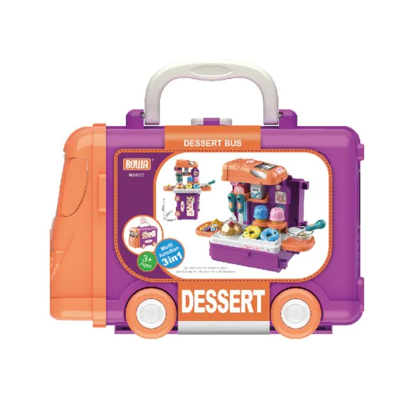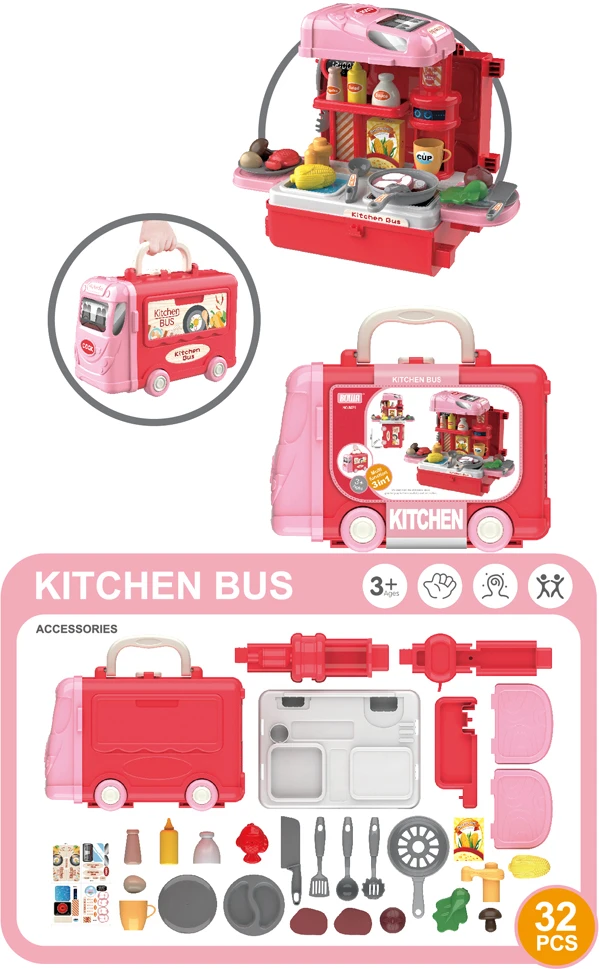 كن أفضل طاهي وطوّر مهاراتك في الطبخ مع مطبخ الأطفال هذا. يأتي مع كل ما تحتاجه: مقلاة، ساطور، أطباق، كوب، مغرفة، ملعقة مسطحة، زجاجة صلصة، مملحات، مواد غذائية، وغيرها. تأتي المكونات على شكل حقيبة سفر بتصميم حافلة، بمقبض عملي. بهذه الطريقة، سيتمكن صغيرك من حمل لعبته المفضلة أينما كان. بالإضافة إلى ذلك، يمكن تحويل الحقيبة إلى طاولة مطبخ.